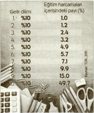 Okula başlangıç giderleri geçen yıla göre yüzde 34.61 oranında arttı. Ana sınıfına başlayan bir öğrencinin maliyeti bile 700 lira tutuyor Türkiye’de her geçen gün artan gelir dağılımındaki adaletsizlik en fazla eğitim harcamalarında hissediliyor. Zenginler, yoksullara göre eğitime 50 kat fazla para harcıyor. Asgari ücretle geçinen bir kişi, okula başlayan çocuğu için bir aylık maaşından fazlasını, en düşük maaş alan memur ise maaşının yüzde 70’ini okul masrafı olarak harcamak zorunda kalıyor. EĞİTİM-İş Sendikası’nın yaptığı araştırmaya göre, öğrencilerin kullandıkları ürün fiyatlarında geçen yıla oranla yüzde 34,6 l’lik bir artış gerçekleşti.