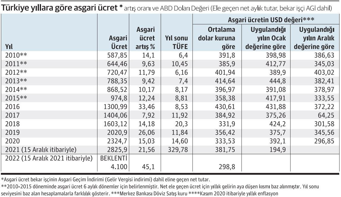 Türkiye’de son dönemde göreli olarak yüksek oranlı artışlara karşılık cinsinden seviye düşük kalmış ve asgari ücretle çalışan kişi sayısının artması nedeniyle asgari ücret ortalama ücrete yaklaşmıştı. Bu yıl da yüzde 40’ların üzerinde bir artış beklentisi hâkim oldu ancak ücret yine de ABD Doları cinsinden 300 doların altında kalacak. Türkiye’deki ücret düzeyinin yabancı doğrudan yatırımları artırma ya da başta Avrupa olmak üzere Türkiye’nin ihracat pazarlarında rekabet avantajı sağlama yönünde bir politika eseri olarak düşük tutulduğu eleştirileri yapılıyor.