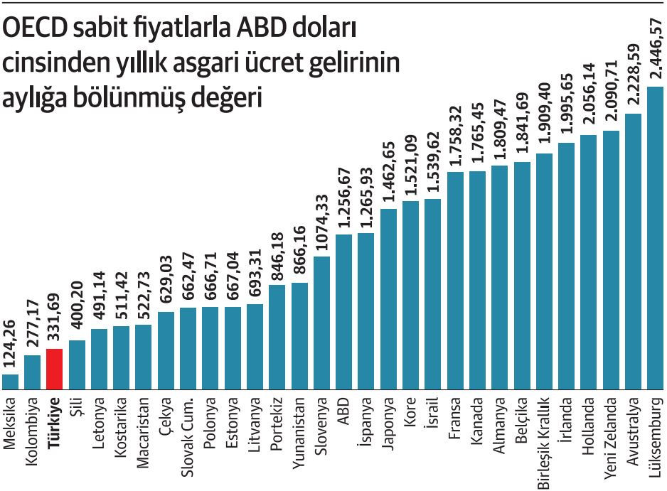 Asgari ücrete yönelik olarak, Sabit fiyatlarla ABD Doları cinsinden ülkelere göre OECD verilerine göre, en düşük aylık asgari ücretler sırasıyla, 124,26 dolar ile Meksika, 277,17 dolar ile Kolombiya, 331,69 dolar ile Türkiye, 400,2 dolar ile Şili ve 431,14 dolar ile Letonya’da veriliyor. OECD aritmetik ortalaması ise 1.190 dolar seviyesinde bulunuyor. Diğer yandan nüfusu ve işgücü fazla olan ülkelerden Almanya, Japonya, İspanya, Birleşik Krallık, Fransa gibi ülkelerde de asgari ücret aylık 1200 doların üzerinde bulunuyor.