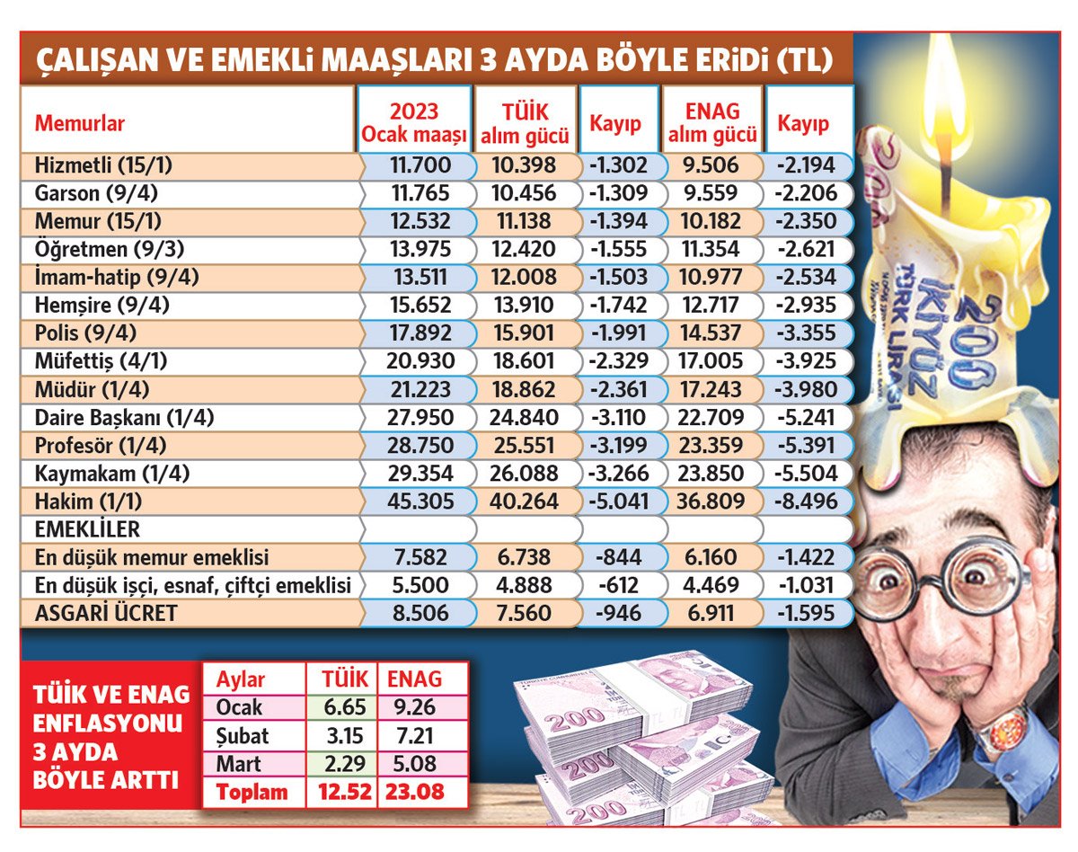Maaşlardaki erimeyi tüm çalışanlar aynı oranlarda hissetti. Örneğin yılın başında 13 bin 975 lira maaş alan öğretmenin 3 ay içinde alım gücünde yaşadığı kayıp ENAG hesabıyla 2 bin 621 lirayı, 17 bin 892 lira maaş alan polis memurunun alım gücü kaybı da 3 bin 355 lirayı buldu. Maaşı yılın başında 15 bin 652 lira olan hemşirenin alım gücü de 2 bin 935 lira azalarak 12 bin 717 liraya düştü.