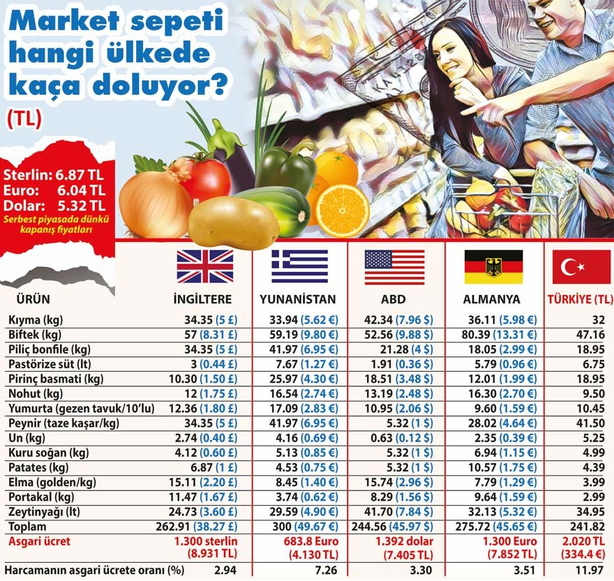 Türkiye’de 8.5 milyon çalışan karnını zor doyuruyor. Temel gıda maddelerinden oluşan market sepeti için Türkiye’de asgari ücretli maaşının yüzde 11.9’unu harcarken, en az 2 kat fazla maaş alan yabancılarda bu oran yüzde 3’e kadar düşüyor.