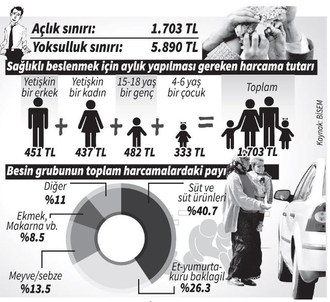 Enflasyonun çift haneye demirlediği ve gelirlerin artmadığı ülkede, yoksulluk sınırı da yükseliyor. Birleşik Metal İş Sendikası Sınıf Araştırmaları Merkezi (BİSAM) tarafından açıklanan mart dönemi açlık ve yoksulluk sınırı verilerine göre yetişkin bir kadının sağlıklı beslenmesi için yapması gereken harcama tutarı 14.57, yetişkin bir erkeğin 15.03, 10- 18 yaş arası bir çocuğun 16.07, 4-6 yaş arası bir çocuğun da 11.09 lira. Böylece asgari ücretlinin geliri açlık sınırının altında kaldı.
