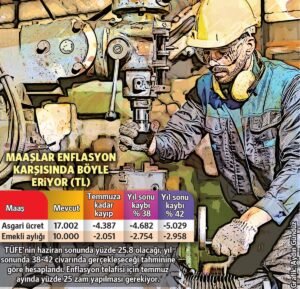 Milyonlarca çalışanın merakla beklediği asgari ücrete zam yolu zora girerken, mevcut şartlarla asgari ücretlinin alım gücü de temmuz ayında enflasyonun altında kalmış olacak. Cumhurbaşkanı Tayyip Erdoğan’dan son anda zam sürprizi gelmezse temmuzda 4 milyon memur ve 12 milyon emeklinin aylığı yüzde 20.3 ile 25.8 arasında artarken asgari ücretlilerle 10 bin liralık en düşük emekli aylığına hiç zam yapılmayacak. Ancak zam yapılmaması sayıları toplamda 11 milyonu aşan bu yoksul kesimin gelirlerinin hiç değişmeyeceği anlamına gelmiyor. Yılbaşı zammından bu yana enflasyondaki artış yüzde 25’i aşacağı için asgari ücretin alım gücü 13 bin 515 liraya, en düşük emekli aylığının alım gücü de 7 bin 949 liraya düşecek. Diğer bir ifadeyle asgari ücretli ve emeklinin reel geliri yerinde saymadığı gibi büyük ölçüde eriyecek. Üstelik bu kesimin hayat pahalılığı karşısında yaşadığı kayıp yılın sonuna kadar artarak devam edecek, açlık sorunu patlak verecek.