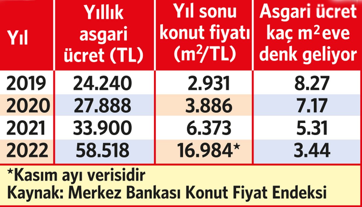 Türkiye hem orta gelirli aileler hem de asgari ücretliler için barınmanın neredeyse imkânsız hale geldiği ülke konumuna dönüştü. TCMB 2022 Kasım ayı konut fiyat endeksi verilerine göre Türkiye genelinde konutların birim metrekare fiyatı 16.984 TL olarak hesaplandı. 2022 yılında net asgari ücret önce 4.253 TL daha sonra ise 5.500 TL olarak belirlendi. Bu durumda 2022 yılında yıllık net asgari ücret 58 bin 518 TL’ye denk geldi. Endeks üzerinden yapılan hesaplamaya göre, 2022 yılında yıllık net asgari ücret 3.44 metrekare eve denk gelmiş oldu.