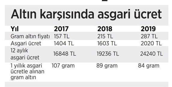 Araştırmaya göre, gram altın fiyatı 31 Aralık 2017 tarihinde 157 TL iken, 31 Aralık 2019’da 287 TL’ye yükseldi. Asgari ücret ise bin 404 liradan 2 bin 20 liraya çıktı. Buna göre bir yıllık asgari ücretle 2017 yılında 107 gram altın alınabiliyorken, bu tutar 2018’de 89 grama, 2019 yılında ise 84 grama geriledi. Araştırmada, asgari ücretlinin her yıl 22 ayar bir altın bilezik kadar kayıp yaşadığı ifade edildi.