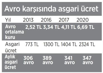 Araştırmaya göre 2013 yılı ile 2016 yılları arasında asgari ücret 83 avro artarken, 2017 ile 2020 yılları arasında sadece 6 avro attı. Raporda, “Asgari ücret 24 Haziran 2018 seçimleri sonrasında yeni hükümet sistemi ile birlikte yaşanan döviz kuru krizi karşısında eridi. 2017 ile 2020 arasında asgari ücret, 2013 ile 2016 yılları arasındaki döneme göre 77 avro değer kaybetti” ifadeleri kullanıldı.
