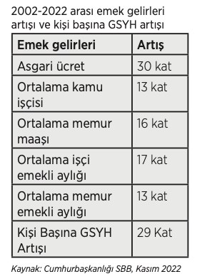 2002-2022 arasında asgari ücret diğer emek gelirleri ile karşılaştırıldığında, en çok artan emek geliri oldu. Cumhurbaşkanlığı Strateji Bütçe Başkanlığı (SBB) verilerine göre, 2002 Aralık ayı ile Temmuz 2022 arasında asgari ücret parasal olarak (enflasyon arındırılmadan) 30 kat artmış. Asgari ücretin bu dönemde resmi enflasyondan oldukça fazla arttığı da sır değil. Hatta asgari ücret artışı neredeyse aynı dönemdeki Kişi Başına Gayri Safi Yurtiçi Hasıla artış oranına denk gelmiş. SBB’ye göre 2002-2022 arasında tahmini Kişi Başına GSYH artışı 29 kat.