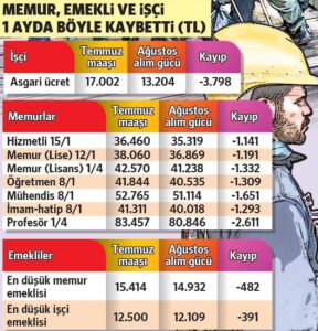 Bir aylık enflasyon memur ve emekli aylıklarında da büyük kayıp yaşanmasına yol açtı. Temmuz ayında 36.460 lira yapılan en düşük memur maaşının alım gücü, 1.141 lira eridi ve ağustos ayında 35.319 liraya geriledi. En düşük memur emeklisinin aylığı temmuz ayında 15.414 liraya çıkmıştı. Ancak ağustos ayında bu emeklilerin alım gücü 482 lira eridi ve böylece 14.932 liraya kadar düştü. 12.500 lira olan en düşük işçi, esnaf ve çiftçi aylığının alım gücü de daha ilk ayda maaşlardaki erimeden nasibini aldı. Bu kapsamda en düşük emekli aylığının alım gücü 12.109 liraya düştü. 20 bin lira olan emekli aylığının alım gücü ise 19.374 liraya kadar geriledi.