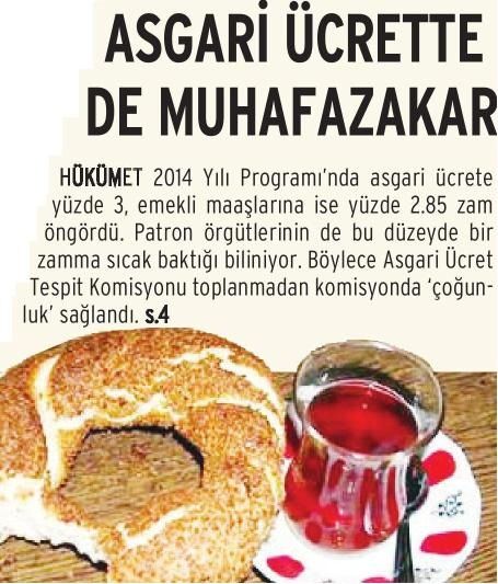 Resmi Gazete’de yayımlanan 2014 Hükümet Programına göre; asgari ücretin 2014 yılı Ocak ve Temmuz aylarında yüzde 3 oranında, devredilen SSK ve devredilen Bağ-Kur emekli aylıklarının ise önceki 6 aylık enflasyon tahminine göre Ocak ve Temmuz aylarında sırasıyla yüzde 2.85 ve yüzde 2.36 oranında artırılması öngörüldü. Bu artış oranına göre; net 803 lira olan asgari ücret 1 Ocak 2014 tarihinden itibaren 827 lira olacak. 24 liralık asgari ücret zammı, günlük 1 lirayı bile bulmuyor.