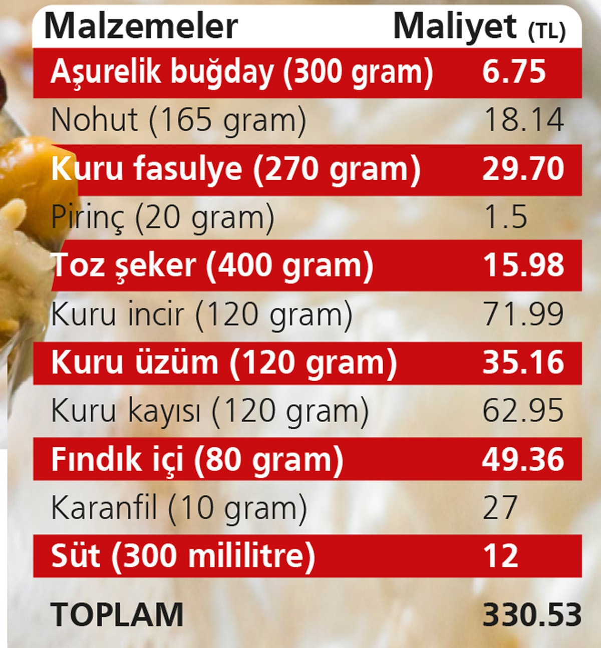 Bolluk ve bereketin simgesi aşurenin de artan gıda fiyatları nedeniyle maliyeti arttı. 12 kişilik bir aşureyi kaynatmanın maliyeti 242 liradan 330 liraya çıktı.