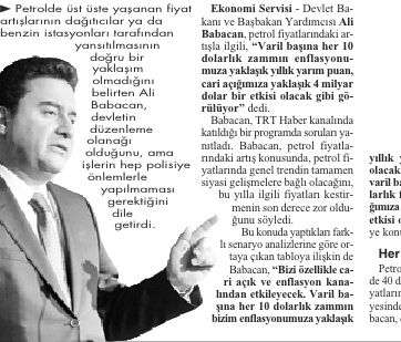 Ekonomi Servisi – Devlet Bakanı ve Başbakan Yardımcısı Ali Babacan, petrol fiyatlarındaki artışla ilgili, “Varil başına her 10 dolarlık zammın enflasyonumuza yaklaşık yıllık yarım puan, cari açığımıza yaklaşık 4 milyar dolar bir etkisi olacak gibi görülüyor” dedi.