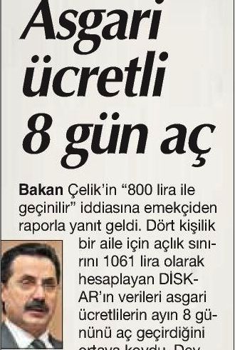 Çelik’in 800 lira ile bal gibi geçinilir iddiasına emekçiden sert yanıt: Asgari ücretli 8 gün aç. DİSK-AR’ın Kasım 2012 verilerine göre Türkiye’de dört kişilik bir işçi ailesi için açlık sınırı 1061, yoksulluk sınırı da 3354 TL olarak gerçekleşti. Bu veriler bile asgari ücretlilerin ayın en az 8 gününü aç geçirdiklerini ortaya koyuyor.
