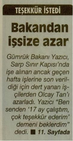Gümrük Bakanı Yazıcı, Sarp Sınır Kapısı´nda işe alınan ancak geçen hafta işlerine son verildiği için dert yanan iş çilerden Olcay Tan´ı azarladı. Yazıcı Ben senden ´17 ay çalıştım, çok teşekkür ederim´ demeni beklerdim dedi.