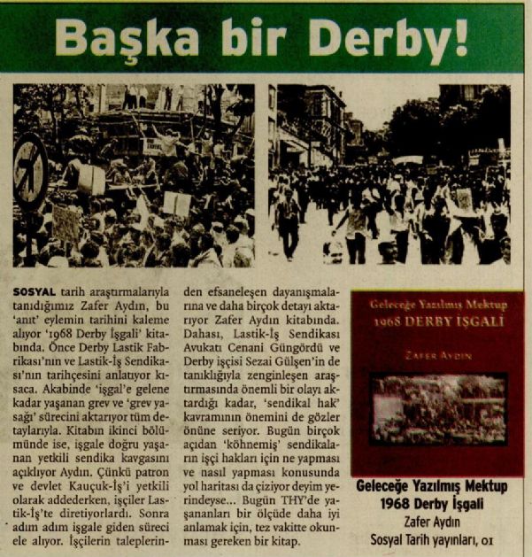 SOSYAL tarih araştırmalarıyla tanıdığımız Zafer Aydın, bu ´anıt´ eylemin tarihini kaleme alıyor ´1968 Derby İşgali´ kitabında. Önce Derby Lastik Fabrikasının ve Lastik-İş Sendikasının tarihçesini anlatıyor kısaca.