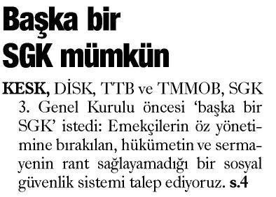 KESK, DİSK, TTB ve TMMOB yarın gerçekleşecek SGK 3. Genel Kurulu öncesi bir basın toplantısı düzenleyerek sosyal güvenlik sisteminin nasıl işletilmesi gerektiği konusunda görüşlerini açıkladı.