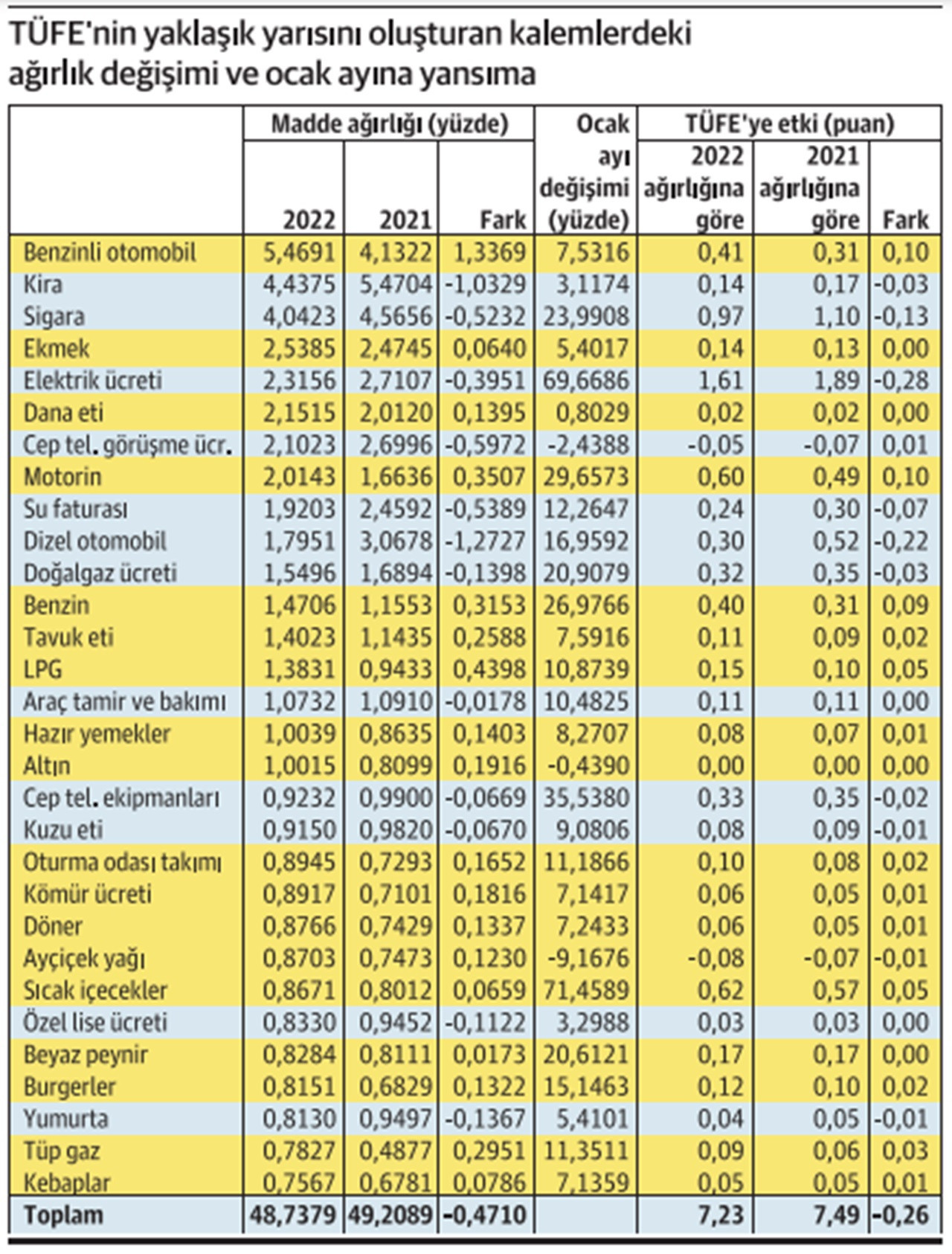 TÜİK dün ocak ayı gerçekleşmeleriyle birlikte madde ağırlıklarındaki değişiklik konusunda da uzun bir açıklama yaptı. Bu konudaki yaklaşımın ve hareket noktasının ne olduğunu daha önce köşemizde birkaç kez yazmıştık. Bir anlamda Avrupa Birliği İstatistik Ofisi’nin çizdiği çerçeveye göre hareket edildi. Her bir kalemde geçen yıl ortaya çıkan fiyat değişimi, bu yılın ağırlıklarının belirlenmesinde temel oluşturdu.