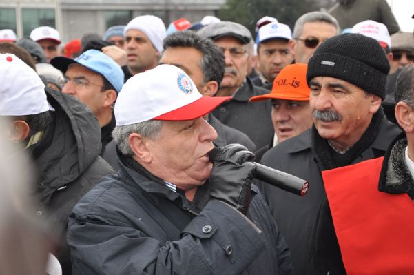 Protesto eyleminde bir konuşma yapan Genel Başkanımız Sn. Mustafa TÜRKEL, AKP Hükümeti’nin yandaş sendika, yandaş meslek kuruluşu, yandan sivil toplum örgütü ve yandaş medya yaratma gayretleriyle tüm, farklı görüş ve sesleri yok etme gayretinin olanca hızıyla devam ettiğini, işçi örgütlerinde orman işçileriyle başlayan sürecin, belediyeler, ÇAYKUR, Hava Yolları, TEKEL gibi kuruluşları hedef aldığını, ancak baskıların son bulmayacağının ortaya çıktığını belirtti. TÜRKEL, konuşmasında bu baskıcı zihniyetle mücadele edileceğini, Istanbul Belediye Başkanı Kadir TOPBAŞ’ın Belediye-iş işçilerinin özgür iradelerine yapılan saldırıları durdurmasını, bağımsız ve kendisine saygısı olan işçi sendikalarının yandaş olmaya razı olmayacaklarını, bu antidemokratik yöntemlerle her şekilde mücadele etmeye kararlı olduklarının altını çizdi.