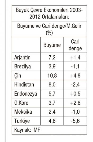 Tabloyu basit tutmak istedim ve iki gösterge ile sınırladım: On yıllık (2003-2012’ye ait) ortalama büyüme hızı ve cari işlem dengesinin milli gelire oranı. (Cari fazlalar “artı”; açıklar “eksi” işaretlidir.) Birinci gösterge, sabit fiyatlı milli gelir serilerinin on yıllık ortalaması (trendi) olarak; ikinci oran ise on yılın cari denge ve dolarlı milli gelir rakamları toplanıp (birikimli olarak) hesaplandı.