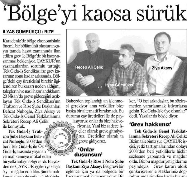 Tek Gıda-İş Trabzon Şube Başkanı Behzat Nuhoğlu: 2008’den beri Tek Gıda-İş ile Öz Gıda-İş arasında yaşanan ve mahkemeye intikal eden bir yetki anlaşmazlığı vardı. Bu yüzden de ÇAYKUR işçileri yaklaşık 5 yıl mağdur edildiler. Şimdi mahkeme kararı ile yetkiyi Tek Gıdaİş aldı. Biz yasal olan haklarımızı kullanmak zorundayız. Hükümet ne çay üreticisini tatmin ediyor, ne de çay işçisini. Biz keyfimize göre grev kararı almadık. İşçilerimizin sosyal ve ekonomik olarak mağduriyetlerini gidermek için böyle bir yola gitmek zorunda kalıyoruz. Çay çok hassas bir tarım ürünü. Bahçeden toplandığı an işlenmesi gerekiyor ama yetkililer bize başka bir alternatif bırakmadı. Bu durumu çay üreticileri ile de paylaşıyoruz, onlar da bize hak veriyorlar. Yani biz sadece işçiler olarak greve gitmiyoruz. Üreticiler olarak ta greve gidiyoruz. Onlar düşünsün’