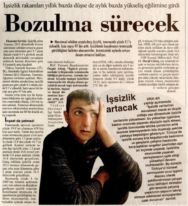 Türkiye İstatistik Kurumu (TÜİK), Hanehalkı İşgücü İstatistikleri Temmuz 2012 (Haziran, Temmuz, Ağustos) verilerini açıkladı. Mevsimsel etkiden arındırılmış işsizlik geçen aya göre yüzde 0.2 artışla yüzde 9.1 ‘e yükseldi. İşsiz sayısı bir önceki aya göre 97 bin arttı. Geçen yılın aynı ayı ile karşılaştırdığında ise işgücüne katılım oranındaki düşüş, 216 bin işsizi sakladı. Temmuz döneminde mevsim etkilerinden anndınlmış işsiz sayısında ise 48 bin kişilik artış yaşandı.
