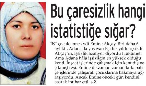 İKİ çocuk annesiydi Emine Akçay. Biri daha 6 aylıktı. Adana´da yaşayan Eşi bir yıldır işsizdi Akçay´m. İşsizlik azalıyor diyordu Hükümet. Ama Adana hâlâ işsizliğin en yüksek olduğu kenti. İnşaat işlerinde çalışmak için kent dışına çıkmıştı eşi. Emine de zaman zaman tarla bahçe işlerinde çalışarak çocuklarına bakmaya uğraşıyordu. Ancak Emine önceki gün kendini asarak intihar etti.