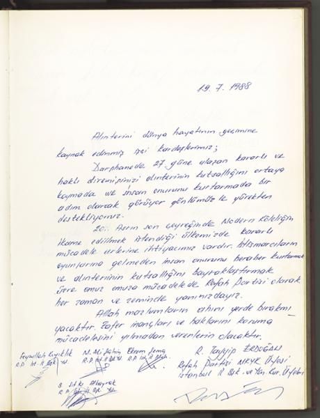 25 yıl önce 1988 yılında yaptıkları grevin anı defterine, o dönem Refah Partisi İstanbul İl Başkanı olan Başbakan Recep Tayyip Erdoğan’ın yazdıklarını okuyan Akkaya, yarın akşam sahuru, Darphane işçileriyle birlikte yapacaklarını duyurarak, "Sayın Başbakanı, bundan 25 yıl önce ziyaret ettiği gibi bu mübarek günlerde, grev çadırında bizleri ziyaret etmeye, haklı ve meşru davamızda bizi desteklemeye davet ediyoruz" dedi.