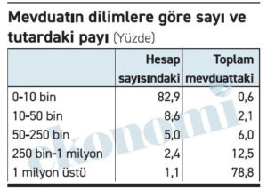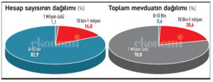 200 milyon hesabın 166 milyonu on bin liraya kadarki hesaplardan oluşuyor. Bu hesaplardaki toplam mevduat ise 132,7 milyar lira. On bin liraya kadar olan hesaplar, toplam hesap sayısında yüzde 82,9’luk bir yer tutuyor. Peki bu hesaplardaki paranın toplam mevduat içindeki payı mı; yalnızca yüzde 0,6.
