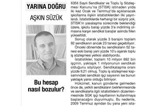 STİSK’in yasalaşma sürecinde beklendiği üzere, işkolu barajı yüzde 3’e indirilmiş olmasına karşın sendikal barajlar aslında fiilen yükseltildi. Sonuç olarak yüzde 3 barajını toplam 92 sendikanın ancak 23 tanesi geçebiliyor. Önceki dönemde bu sendikaların 52 tanesi eski barajı yani yüzde 10’u aşarak toplu iş sözleşmesi yetkisi alabiliyordu. istatistikler, toplam 10 milyon 882 bin işçinin, yaklaşık 1 milyonunun sendikalı olduğunu söylüyor. Sendikalaşma oranı yüzde 9,21 olmuş. Toplu iş sözleşmesi kapsamındaki sendikalı işçi sayısının ise bunun yaklaşık yarısı olduğu biliniyor.