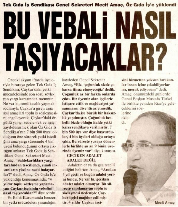 Önceki akşam iftarda üyeleriyle biraraya gelen Tek Gıda İş Sendikası, Çaykur’daki yetki mücadelesinde son sözü söyleyen yargı kararından memnun. Ne var ki, sendikacılık yapmak iddiasıyla Çaykur’a giren ama asıl amaçları toplu iş sözleşmesini engelleyerek, Çaykur’daki örgütlü yapıyı zedelemek ve işçiyi zayıf-düşürmek olan Öz Gıda İş Sendikası’nın 7 bin 500 üyesi olduğunu öne sürerek yetki istediğini ama yargı sürecinde 4 bin üyesi bulunduğunun ortaya çıktığını anlatan Tek Gıda İş Sendikası Genel SEKRETERİ Mecit Amaç, "Sahtekarlıkları yargı tarafından tescillendi, şimdi insanların yüzüne nasıl bakıyorlar?" dedi. Amaç, Öz Gıda İş’e yüklendiği konuşmasında, "4 yıldır toplu sözleşme yapamayan Çaykur işçisinin vebalini nasıl taşıyacaklar?" diye sordu.