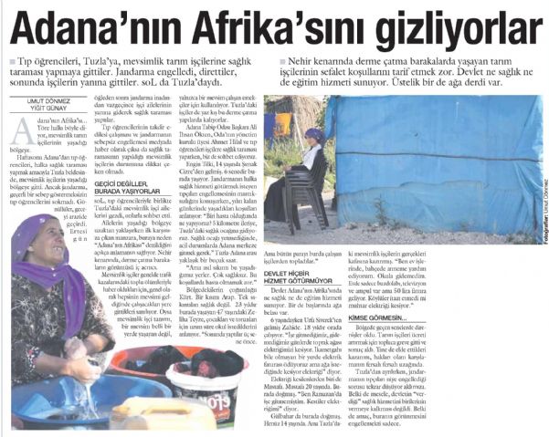Haftasonu Adana’dan tıp öğrencileri, halka sağlık taraması yapmak amacıyla Tuzla beldesinde, mevsimlik işçilerin yaşadığı bölgeye gitti. Ancak jandarma, geçerli bir sebep göstermeksizin tıp öğrencilerini sokmadı. Gönüllüler, geceyi arazide geçirdi. Ertesi öğleden sonra jandarma inadından vazgeçince işçi ailelerinin yanına giderek sağlık taraması yaptılar.