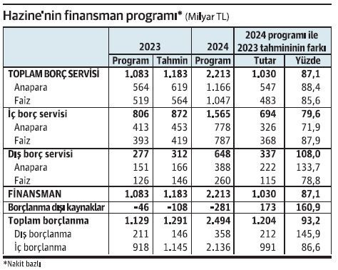 Hazine, 2024 yılında bu yıla göre nakit bazlı olarak 1 trilyon liradan daha fazla borçlanmak (toplam 2.2 trilyon) ve tabii ki aynı tutarda finansman bulmak durumunda. Bu yıla göre artışın oranı yüzde 87.