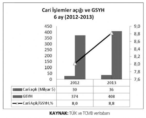 Türkiye isterse yüzde 4 büyüsün, cari açığına bakıldığında herkesin ödünü koparıyor. Çünkü 6 ayda cari açığı 36 milyar dolar. Altı ayın milli gelirini ise TÜİK 409 milyar dolara yakın açıkladı. O zaman, bölün cari açığı milli gelire ediyor yüzde 8,8!…Müthiş bir oran. Dudak uçuklatıcı. 2012’nin ilk 6 ayından yukarıda. Çünkü 2012’nin ilk 6 ayında cari açık 30 milyar dolardı ve milli gelir de 374 milyar dolar. Yani cari açık/GSYH, 8 puandı. Geçen yıla göre ekonomi büyüdükçe cari açık da büyümüş, neredeyse 1 puan artmış.