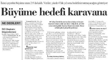 İstanbul Sanayi Odası (İSO) Başkanı Tanıl Küçük: İlk altı ayda ortalama büyümenin yüzde 3.1 olarak gerçekleşmesi, yılın tamamı için öngörülen yüzde 4’lük büyümenin yakalanmasını riske atmıştır. Tüketim ve yatırım harcamalarının eksiye geçmesi önemli ve düşündürücü.