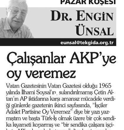 Vatan Gazetesinin Vatan Gazetesi olduğu 1965 yılında İlhami Soysal’ın sulandınlmamış Çetin Altan’ın AP iktidarına karşı amansız mücadele verdiği günlerde gazetenin ikinci sayfasında, "İşçiler Adalet Partisine Oy Veremez" diye bir yazı yazmıştım ve başta Türk-İş olmak üzere bir çok sendika kıyameti koparmış ve "bir sendika çalışanı işçileri, AP’ye karşı kışkırtamaz" diye beni çarmıha germişlerdi.