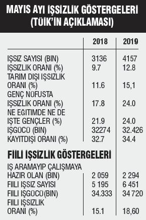 Ekonomide küçülme devam ettiği sürece işsizlikte artacaktır. Cuma Günü açıklanan Haziran ayı Sanayi üretim endeksi geçen yılın Haziran ayına göre yüzde 9.6 oranında geriledi. 2005 = 100 bazlı sanayi üretim endeksi 2019 haziran ayında yüzde 96.9 oldu. Yatırım malı üretimi endeksi de aynı şekilde yüzde 13.8 oranında geriledi. Bu demektir ki GSYH’da küçülme devam ediyor.