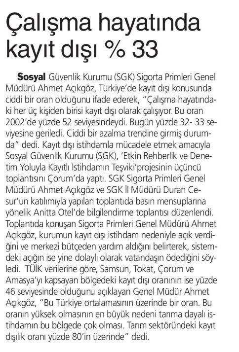Sosyal Güvenlik Kurumu (SGK) Sigorta Primleri Genel Müdürü Ahmet Açıkgöz, Türkiye’de kayıt dışı konusunda ciddi bir oran olduğunu ifade ederek, "Çalışma hayatındaki her üç kişiden birisi kayıt dışı olarak çalışıyor. Bu oran 2002’de yüzde 52 seviyesindeydi. Bugün yüzde 32- 33 seviyesine geriledi. Ciddi bir azalma trendine girmiş durumda" dedi.