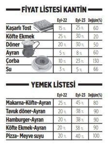 Gıda fiyatlarında yaşanan astronomik artışlar okul kantinlerini de vurdu. Okul kantinlerindeki birçok gıda ürünü fiyatları nedeniyle ulaşılamaz hale gelirken çocuklar adeta açlığa mahkûm edildi. Kantindeki gıda fiyatlarında, Eylül 2023 itibarıyla Eylül 2022’ye oranla yüzde 100’lere varan artışlar yaşandı.