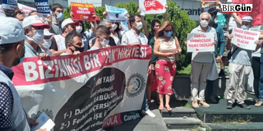 Cargill’de çalışırken Tekgıda-İş sendikasına üye olduktan sonra işten çıkarılan ve 2,5 yıl önce fabrika önünde eyleme geçen işçiler, direnişlerini yeniden şirketin İstanbul, Ataşehir’deki Palladium Tower’da bulunan genel merkezi önüne taşıdı.