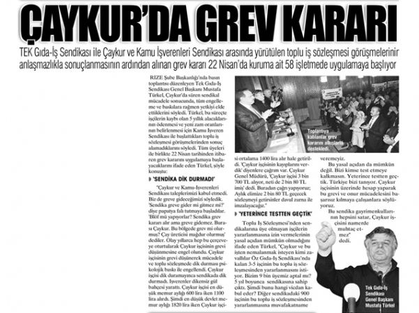 Tekgıda-iş Sendikası ile Çaykur ve Kamu işverenleri Sendikası arasında yürütülen toplu iş sözleşmesi görüşmelerinir anlaşmazlıkla sonuçlanmasının ardından alınan grev kararı 22 Nisan´da kuruma ait 58 işletmede uygulamaya başlıyor