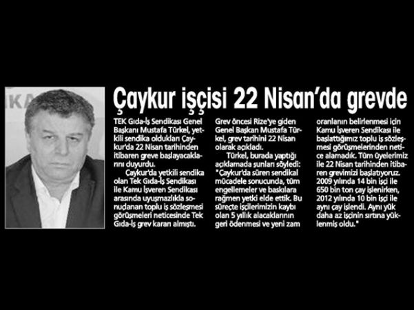 TEKGIDA-İŞ Sendikası Genel Başkanı Mustafa Türkel, yetkili sendika oldukları Caykur’da 22 Nisan tarihinden itibaren greve başlayacaklarını duyurdu. Caykur’da yetkili sendika olan Tek Gıda-ls Sendikası ile Kamu İşveren Sendikası arasında uyuşmazlıkla sonudanan toplu is sözleşmesi görüşmeleri neticesinde Tek Gıda-ls grev karan almıştı. Grev öncesi Rize’ye giden Genel Başkan Mustafa Türkel, grev tarihini 22 Nisan olarak açıkladı.