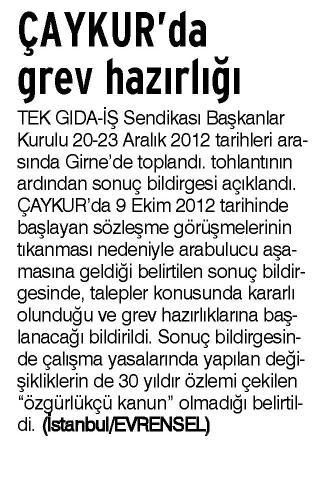 ÇAYKUR’da 9 Ekim 2012 tarihinde başlayan sözleşme görüşmelerinin tıkanması nedeniyle arabulucu aşamasına geldiği belirtilen sonuç bildirgesinde, talepler konusunda kararlı olunduğu ve grev hazırlıklarına başlanacağı bildirildi. Sonuç bildirgesinde çalışma yasalarında yapılan değişikliklerin de 30 yıldır özlemi çekilen "özgürlükçü kanun" olmadığı belirtildi.