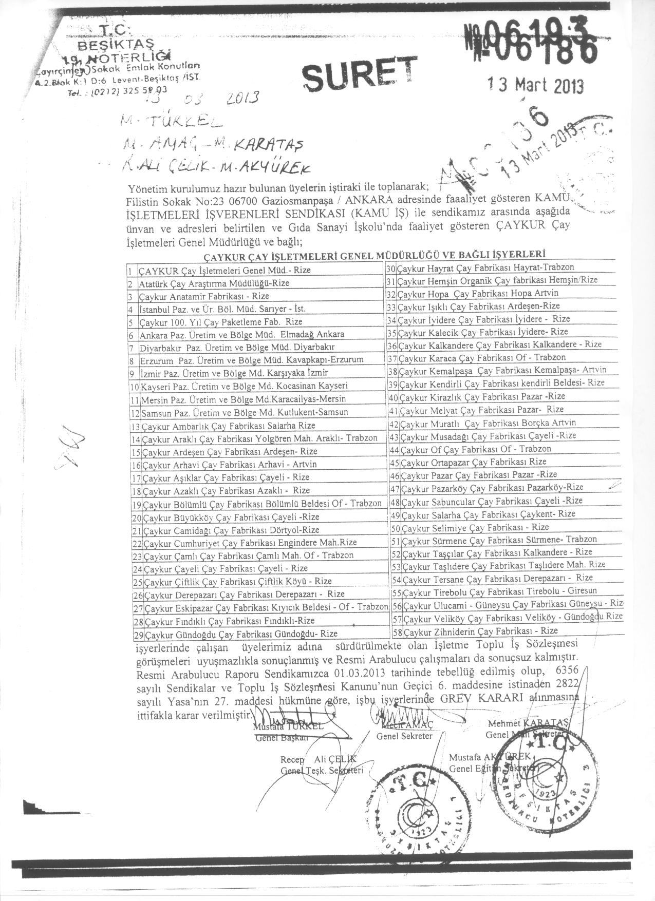 Sendikamız, ÇAYKUR, Çay İşletmeleri Genel Müdürlüğü ve bağlı işyerlerinde çalışan üyeleri adına KAMU-İŞ (Kamu İşletmeleri İşverenleri Sendikası) ile sürdürdüğü işletme toplu iş sözleşmesi görüşmelerinin akamete uğramasının ardından, GREV kararı alarak işyerlerinde ilan etti.