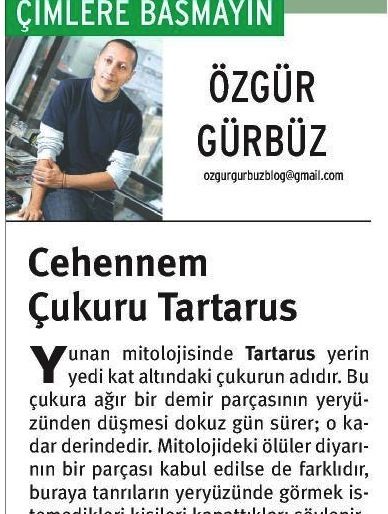 Taksim’de ı Mayıs kutlamalarını engellemek için bahane edilen çukur aslında Tartarus’tur. Hükümetin kaygısı elbette "işçiler Tartarus’a düşmesin" kaygısı değildir. Çünkü bizim memlekette işçiler zaten her gün Tartarus’u aratmayan şantiyelerde çalışır. AVM inşaatlarında yanarak can verenlerin ülkesinde cehennem ateşi nedir ki?