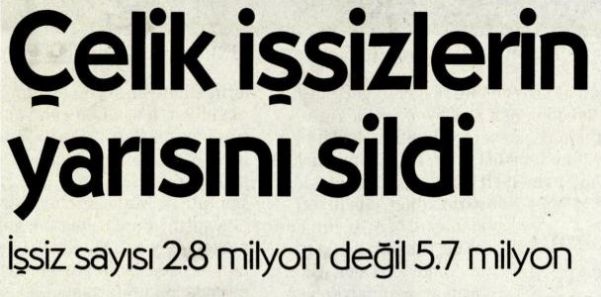 Çelik’in bu açıklamasına karşın Ocak 2015 dönemi resmi işsizlik oranı yüzde 11.3. İşsiz sayısı da resmi rakamlara göre 3 milyon 258 bin kişi, umudunu kaybedenlerle birlikte işsizlik oranı yüzde 18.5’e çıkıyor.