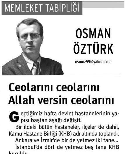 Geçtiğimiz hafta devlet hastanelerinin yapısı baştan aşağı değişti. Bir ildeki bütün hastaneler, ilçeler de dahil, Kamu Hastane Birliği (KHB) adı altında toplandı. Ankara ve İzmir´de bir de yetmez iki tane…