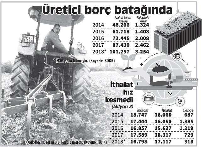 2018’de yüzde 120 artan maliyetlerin 2019’da da üreticiyi zorlamaya devam etmesi ve tarımsal üretimi düşürmesi bekleniyor. Yurttaş ise bu yıl da pahalı gıdaya mahkûm. Hükümet Ziraat Bankası’na kulüplerin borçları ile kredi kartı borçlarını yıkarken, asıl hizmet verilmesi gereken çiftçi ise borç batağında. 7 bine yakın çiftçi icralık durumda.