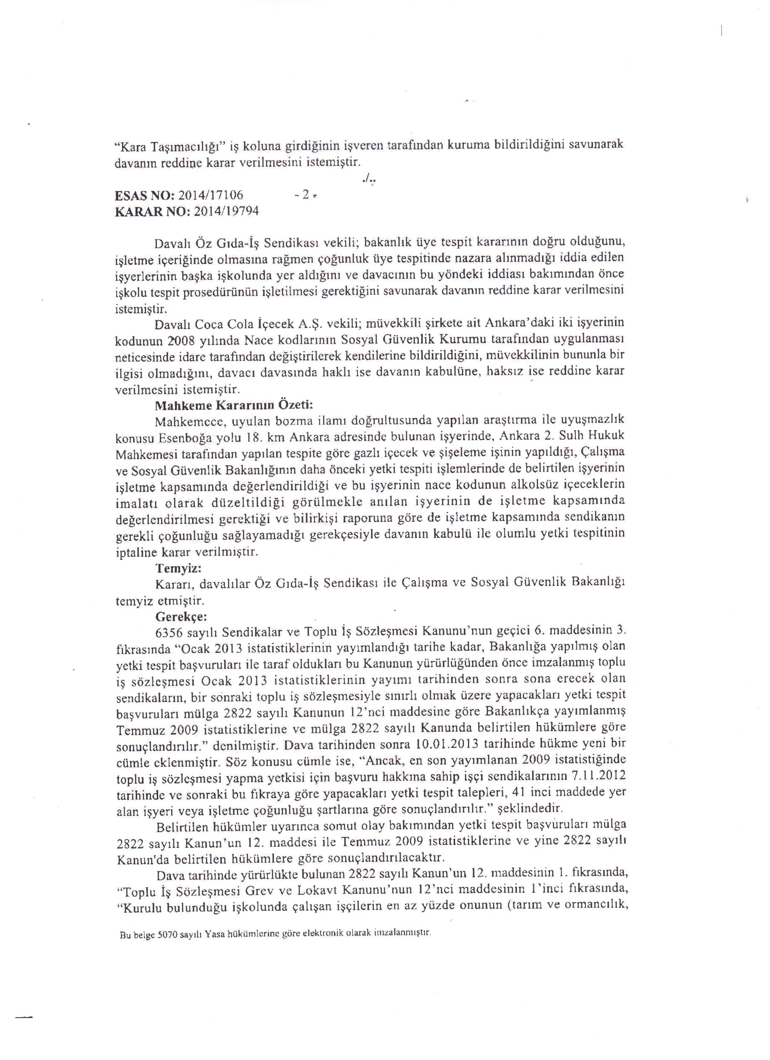 Esenboğa yolu – Ankara adresinde bulunan işyerinde gazlı içecek üretim ve şişeleme faaliyetinde bulunulduğu, Etimesgut – Ankara adresinde bulunan işyerinde ise üretilen mamullerin depolandığı ve sevk edilme faaliyetinde bulunulduğu ve bu nedenle de her iki işyerinin sendikamızın örgütlü bulunduğu işkoluna dâhil olduğu maddi bir vakıadır.