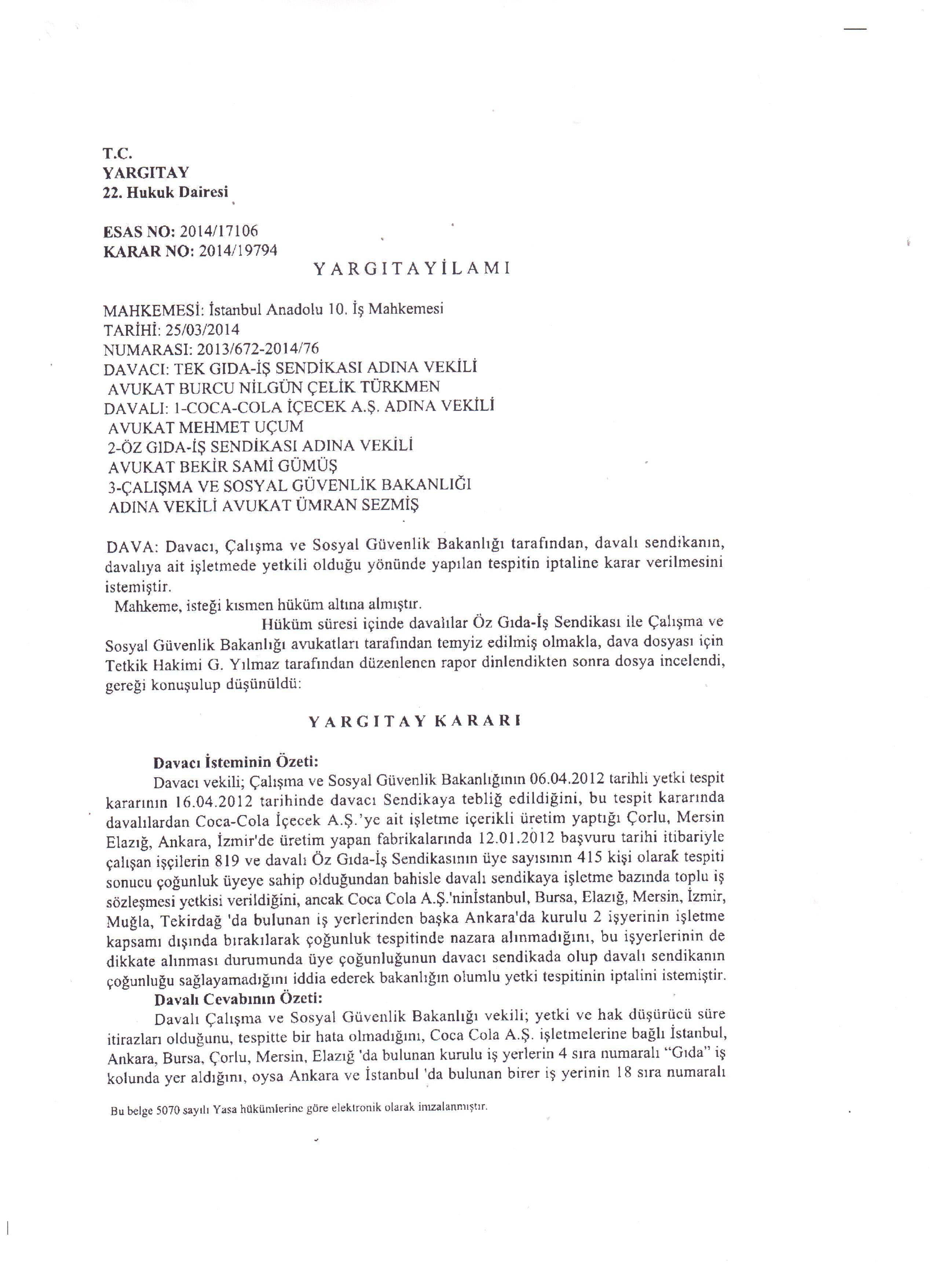 Coca Cola İçecek A.Ş. İşletmesi için, Sendikamızın açtığı davada İstanbul Anadolu 10. İş Mahkemesi’nin lehimize verdiği karar Yargıtay 22. Hukuk Dairesi tarafından eksik inceleme nedeniyle bozulmuştur.