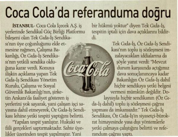 Coca Cola İçecek A.Ş. işyerlerinde Sendikal Güç Birliği Platformu bileşeni olan Tekgıda-İş Sendikası’nın üye çoğunluğunu elde etmesine rağmen, Çalışma Bakanlığı, Öz gıda-İş Sendika sı’nın yetkili sendika olduğuna karar verdi.