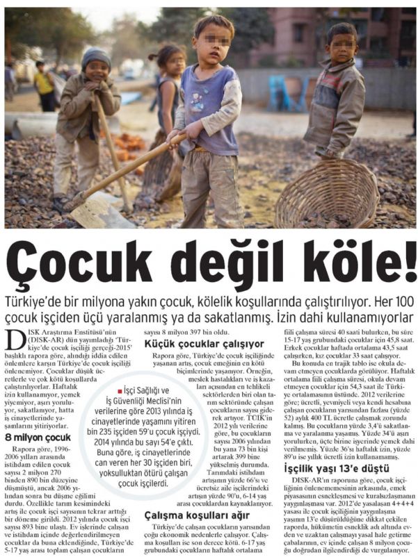 DİSK Araştırma Enstitüsü’nün (DİSK-AR) dün yayımladığı ‘Türkiye’de çocuk işçiliği gerçeği-2015 başlıklı rapora göre, alındığı iddia edilen önlemlere karşın Türkiye’de çocuk işçiliği önlenemiyor. Çocuklar düşük ücretlerle ve çok kötü koşullarda çalıştırılıyorlar. Haftalık izin kullanamıyor, yemek yiyemiyor, aşırı yoruluyor, sakatlanıyor, hatta iş cinayetlerinde yaşamlarını yitiriyorlar.